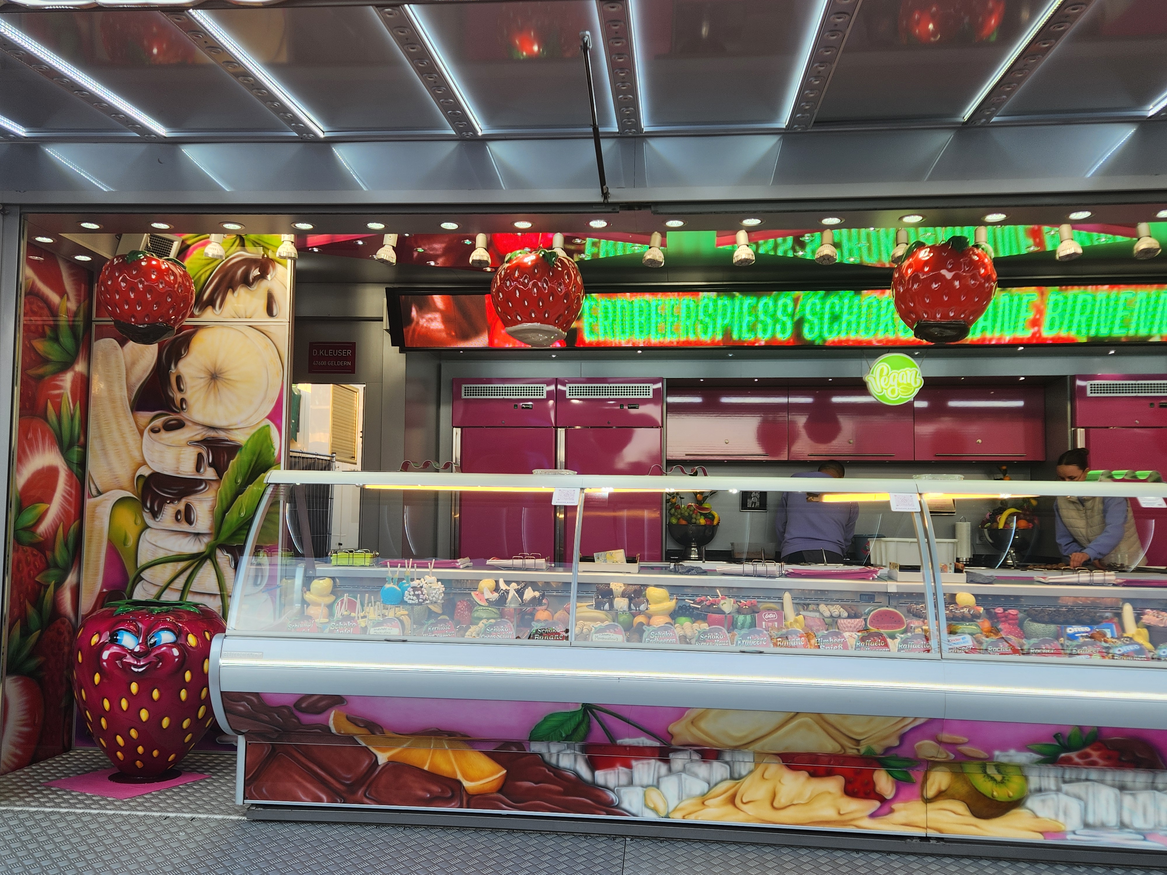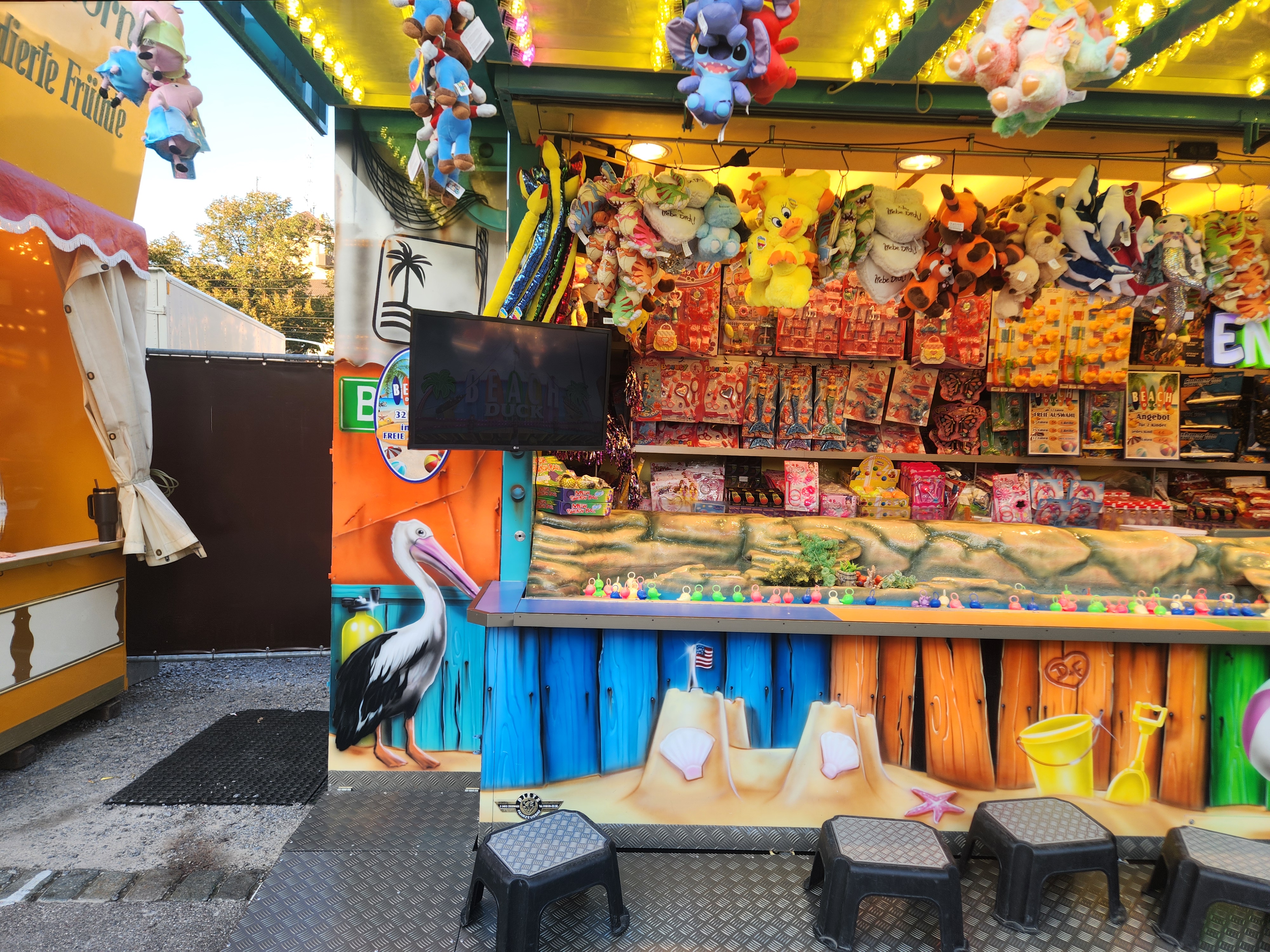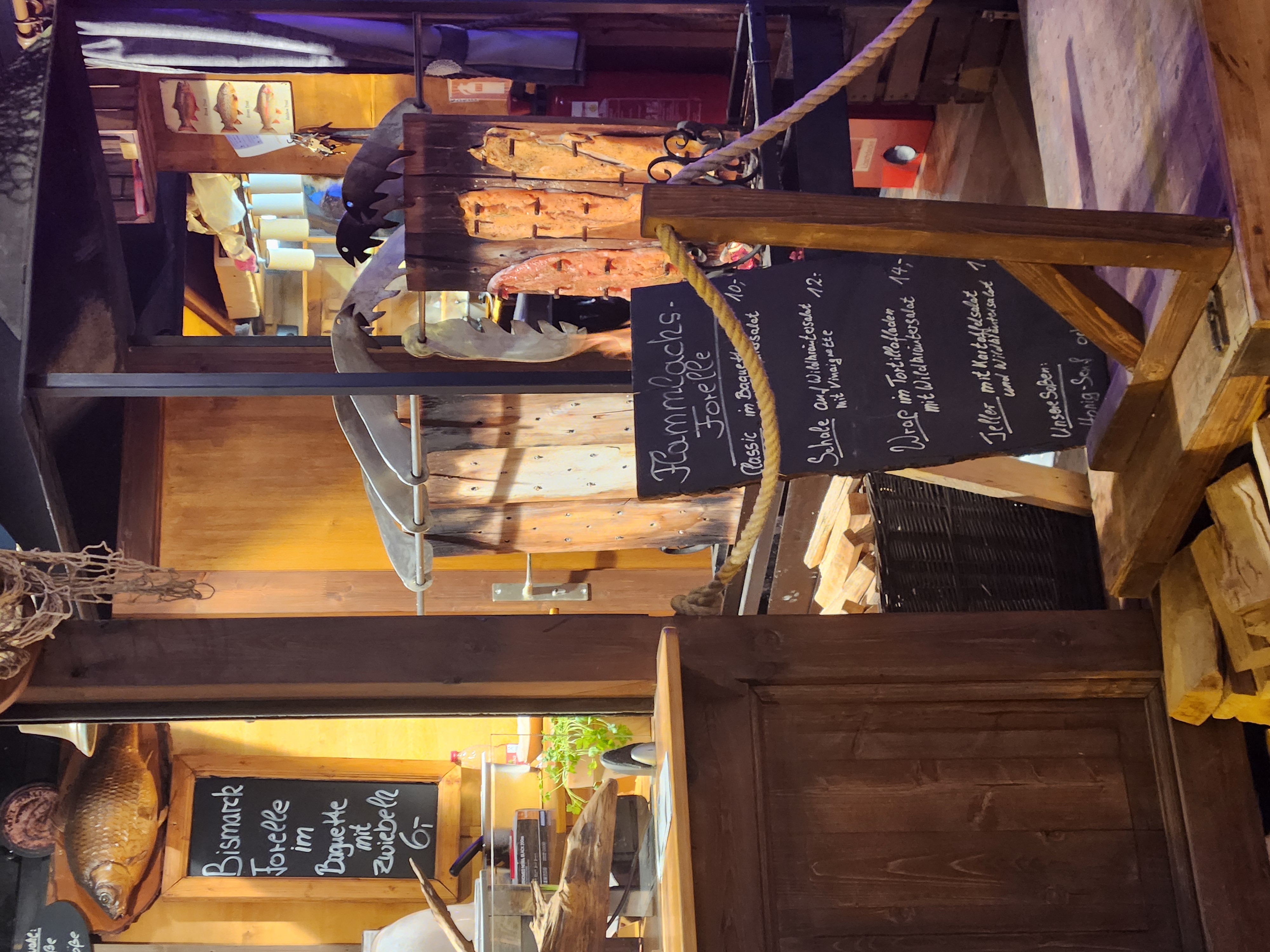 다양한 먹거리들. 늘 그렇듯 부어스트-글뤼바인 부스, 햄버거, 초코 코팅 과일이 있고, 특이하게도 말린 생선 구이가 있더라고요.