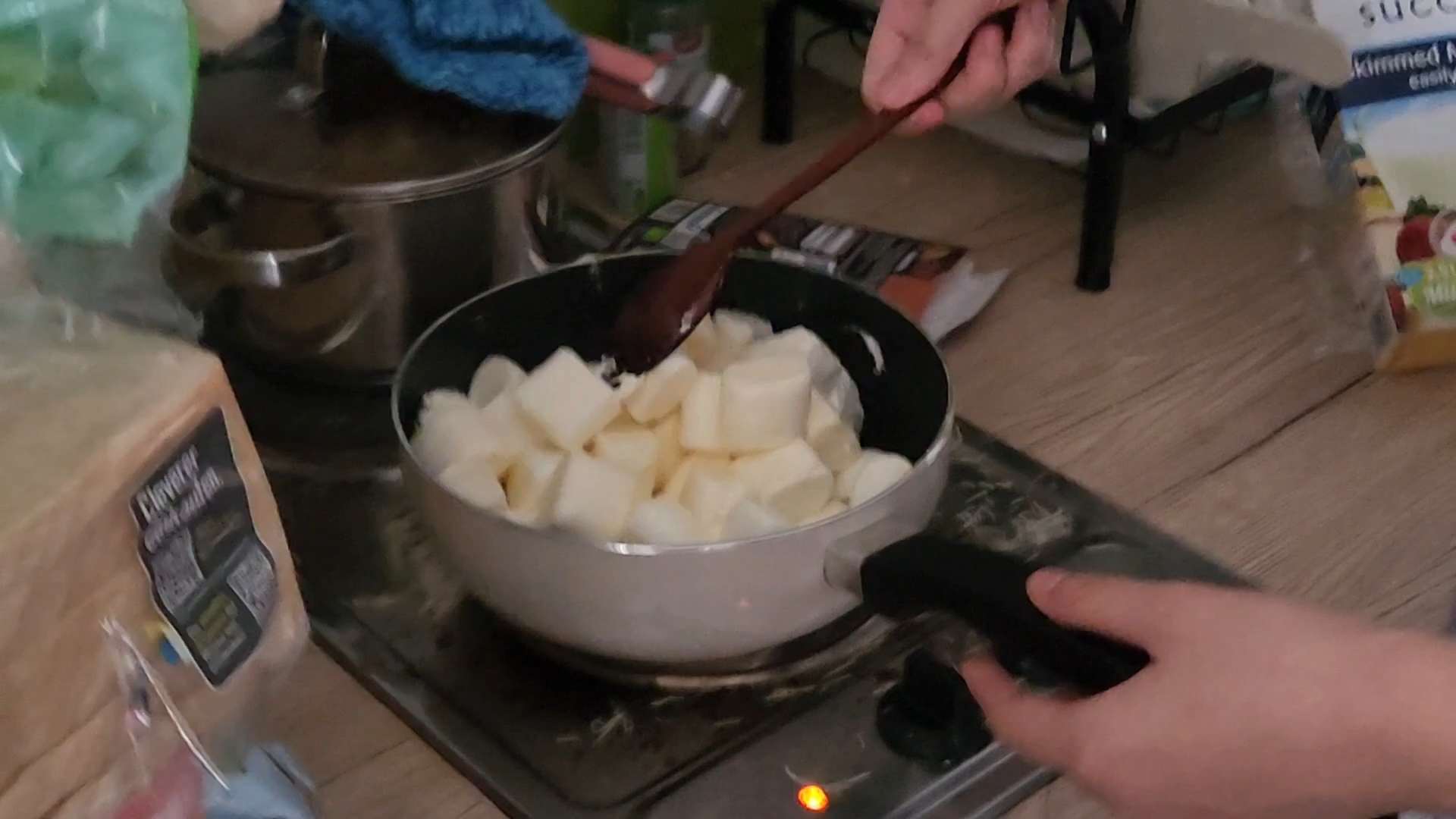 버터를 녹인 후 그 위에 마시멜로를 섞어 가며 녹인다. 이때 마시멜로를 너무 오래 녹이면 나중에 흘러내리기 때문에 적당히만 녹여 주는 것이 핵심이라고(라는 권 선생님의 말씀).