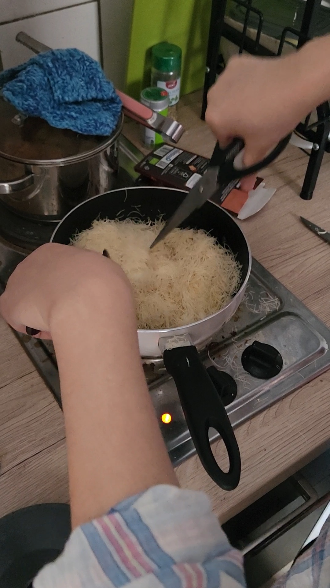 이제 피스타치오 스프레드와 구워 둔 카다이프를 섞어야 하는데...